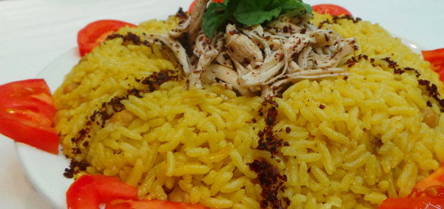 ■ يوضع على وجه الأرز الدجاج المسلوق المضاف إليه الملح والفلفل الأسود والسماق، وتقدم بجانبه صلصلة طماطم بالفلفل الحار.