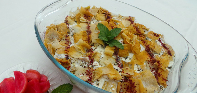 - يضاف الخبز المحمص على وجه الطبق، ويزين بالسماق والنعناع الأخضر.