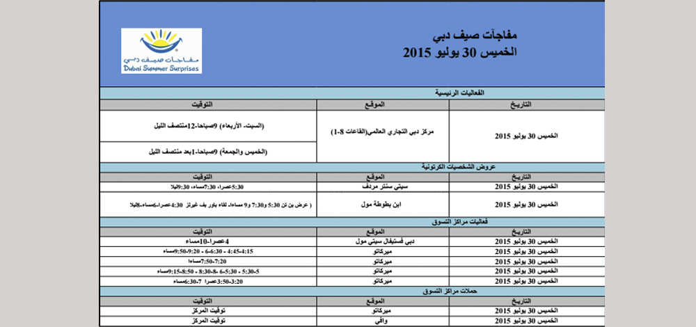 جدول فعاليات وأنشطة مفاجآت صيف دبي ليوم غد الخميس 30 يوليو 2015.