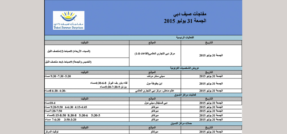 جدول فعاليات وأنشطة مفاجآت صيف دبي ليوم غد الجمعة 31 يوليو 2015.