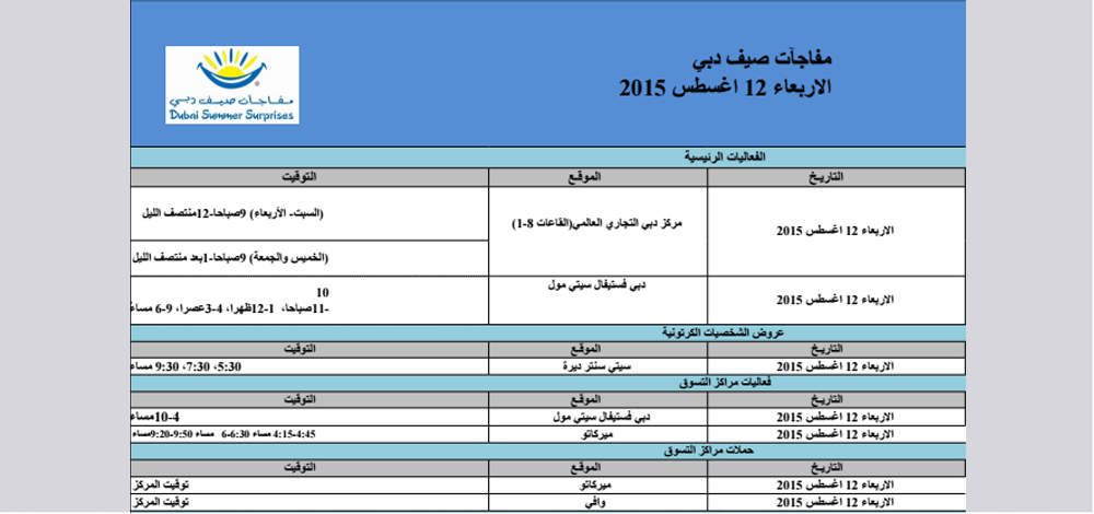جدول فعاليات وأنشطة مفاجآت صيف دبي ليوم غد الأربعاء 12 أغسطس 2015 .