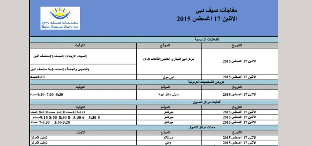 جدول فعاليات وأنشطة مفاجآت صيف دبي ليوم غد الأثنين 17 أغسطس 2015 .