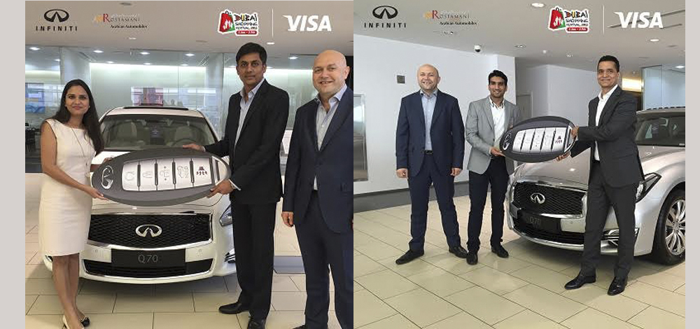 منحت فيزا خلال الأسبوع الأول من مهرجان دبي للتسوق، حاملي بطاقاتها فرصة الإستفادة من عرضين مغريين على سيارتي إنفينيتي Q70، تبلغ قيمة الواحدة منها 161 ألف درهم في حين حصل عليها حامل البطاقة المشارك مقابل 25 ألف درهم، أي بأقل من 85% من سعر المبيع. وقد فاز بالسيارتين يوغيش كومار ياداف ومانسي شانديكار.