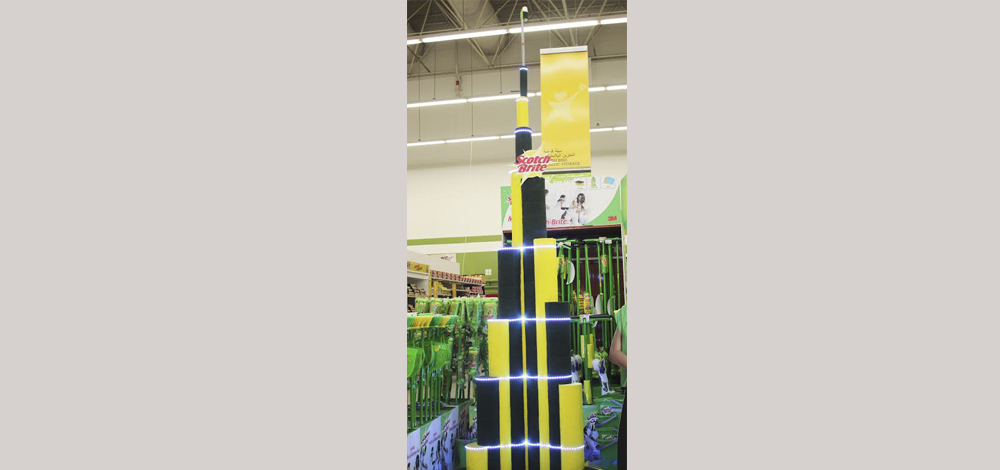 صممت علامة "سكوتش برايت" لمنتجات التنظيف نموذجا طبق الأصل عن برج خليفة بارتفاع 12 قدماً باستخدام منتجاتها في مول دبي، احتفالا بريادتها في السوق.
