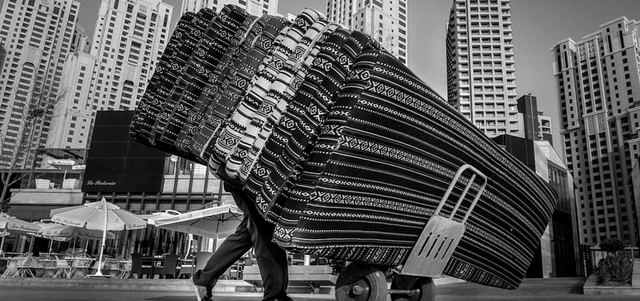 عامل يقوم بنقل جلسات أرضية بمنطقة شاطئ جميرا.