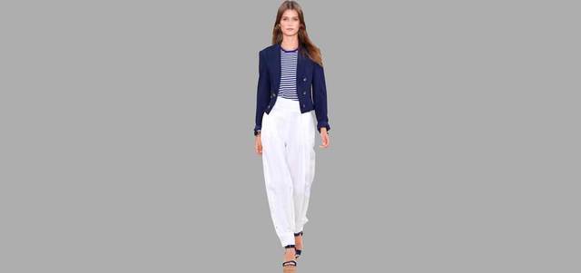 ويتم تنسيق التيشيرت مع بليزر يكتسي بالأزرق أيضاً ويزدان بأزرار ذهبية، وسروال شينو باللون الأبيض أو البيج وبطول 7/8. وتكتمل هذه الإطلالة بحذاء البحّارة الكلاسيكي، الذي يمتاز بنعل مطاطي أملس وشريط جلدي يلتف حول الحذاء.