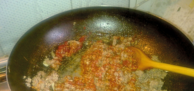 يُقلَّب اللحم والثوم والزيت على النار إلى حين النضج التام، ثم تضاف الصلصة والبهارات وتقلب لمدة أقل من دقيقة.