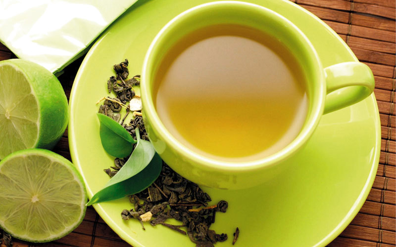 ليتر ماء نقي + نصف كوب أوراق الشاي الأخضر الجاف + ثلاث حبات من الليمون الأخضر المقطعة دوائر + أربع ملاعق كبيرة عسل + قطع بسيطة من الثلج.