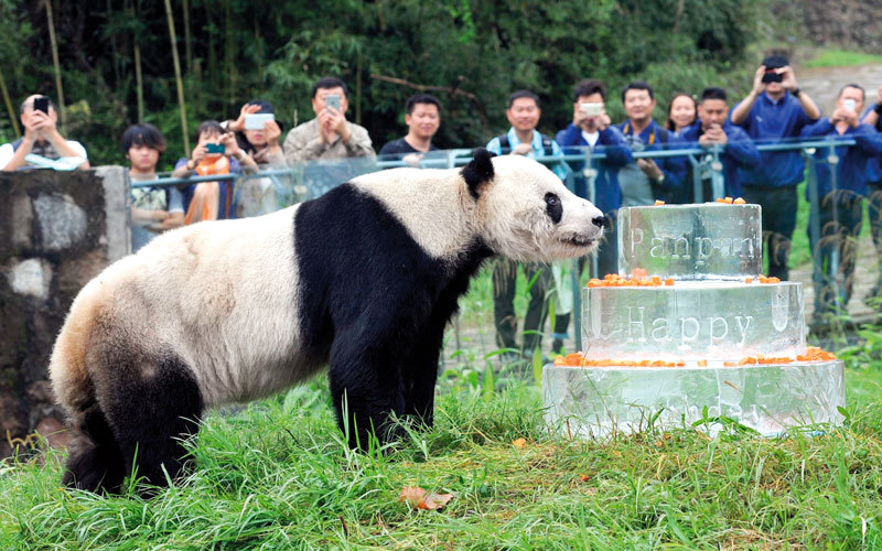 صورة أرشيفية يعود تاريخها لـ21 سبتمبر 2015، يظهر فيها دب الباندا العملاق «بان بان»، وهو يتفحص كعكة عيد ميلاده الـ30 المصنوعة من المثلجات في محمية مركز أبحاث دببة الباندا العملاقة بمحافظة سيشوان بالصين. أ.ف.ب