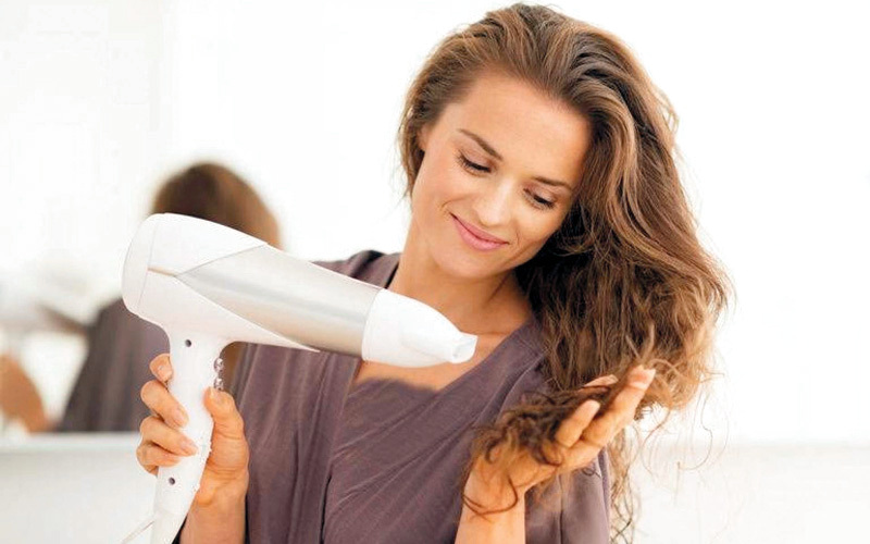 من الأفضل ترك الشعر في الهواء ليجف. ولكن إذا كان من اللازم استخدام مجفف الشعر، فينبغي حينئذ توجيهه إلى الجذور قدر المستطاع، مع مراعاة تعريض الخصلات الطويلة والأطراف للهواء الساخن بقدر ضئيل؛ نظراً لأن التقصف ينجم عن الجفاف. وينبغي ألا تزيد درجة حرارة المجفف على درجة حرارة الجسم، مع مراعاة استخدام «اسبراي» الحماية من السخونة. ويمتاز مجفف الشعر الأيوني الحديث بقدرته على تجفيف الشعر بسرعة وبشكل يحافظ عليه.