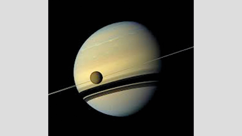 «تيتان» غني بالبحار والبحيرات وهو المكان الوحيد في المجموعة الشمسية الذي اكتشفت على سطحه سوائل. من المصدر