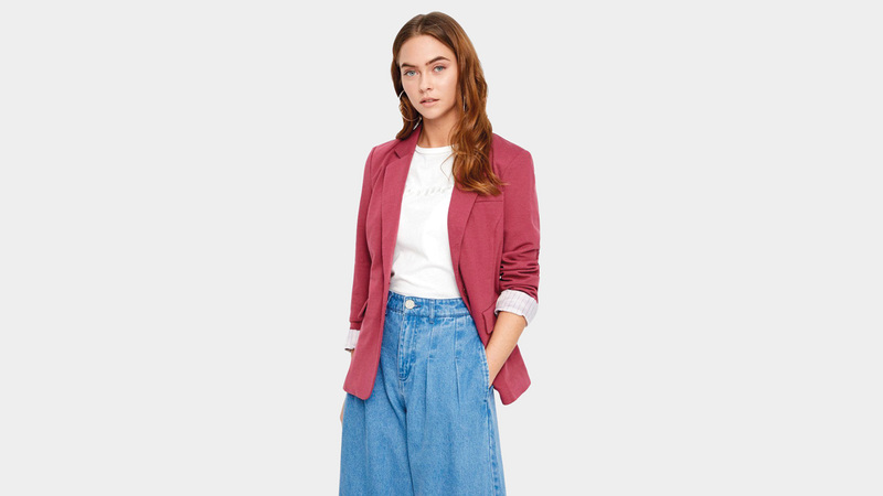 «البليزر» التوتي يتناغم مع الأبيض والوردي وكذلك الجينز. د.ب.أ