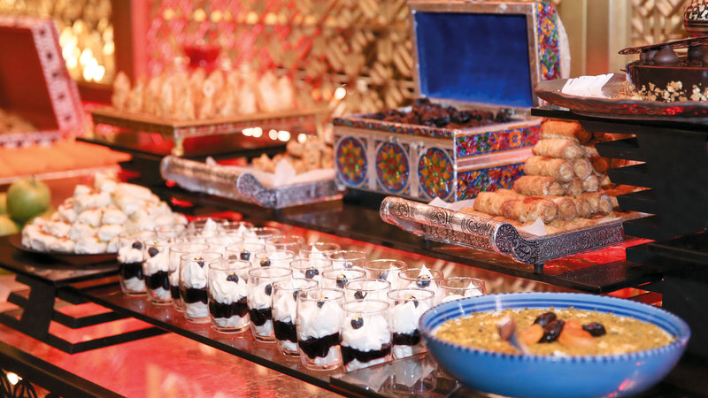 كما يحظى الضيوف بفرصة اختيار بوفيه الإفطار اليومي الشهي، الذي يشمل قائمة تقليدية من الأطباق العربية المحضرة خصيصاً لهذا الشهر، بدءاً من سلطات الخضار والمقبلات العربية، بما في ذلك الحمص والفتوش وسلطة الجرجير وورق العنب وسلطة القرنبيط مع صلصة الطحينة مقابل 185 درهماً فقط. فيما تقدم منصات الطهو الحية تشكيلة من المشاوي الشرقية اللذيذة وأوزي لحم الضأن وشاورما الدجاج، أو المقبلات العربية الساخنة وغيرها.