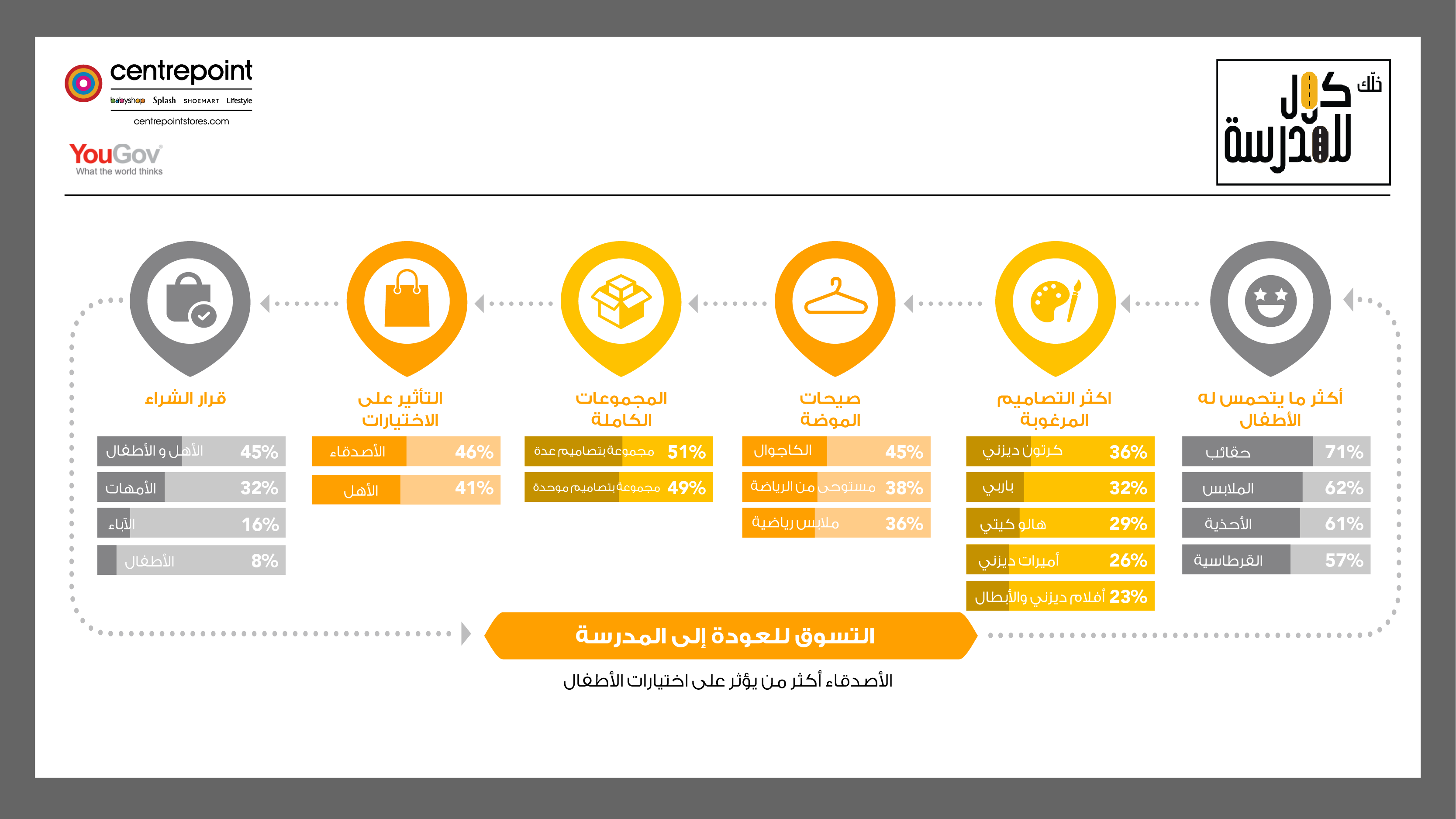 كشف استطلاع جديد للرأي أعدّته شركة "يوجوف" بتكليف من "سنتربوينت"، وجهة الأزياء التابعة لمجموعة "لاندمارك"، بأن الأصدقاء والأقران يؤثرون على خيارات الأطفال بخصوص شراء مستلزمات العام الدراسي الجديد. وشمل الاستطلاع ما يزيد على 1000 مشارك– معظمهم من الأهالي– من جميع أنحاء منطقة الشرق الأوسط وشمال أفريقيا.
