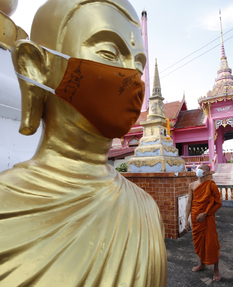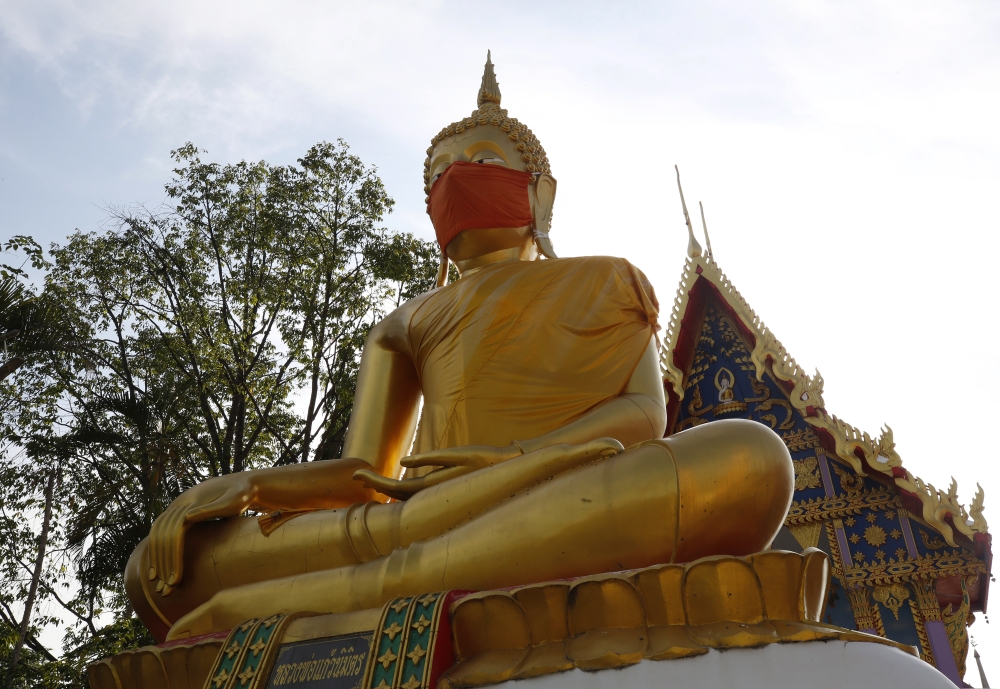 جرى وضع كمامة على تمثال كبير لبوذا في معبد في العاصمة التايلاندية بانكوك، من أجل التوعية بمخاطر فيروس كورونا. وقال فرا تاويسوب سانتامانو، رئيس دير وات نيثيتراتبراديت في ضواحي العاصمة" لقد فعلنا ذلك لكي يرى المارة أنه حتى بوذا يرتدي كمامة".