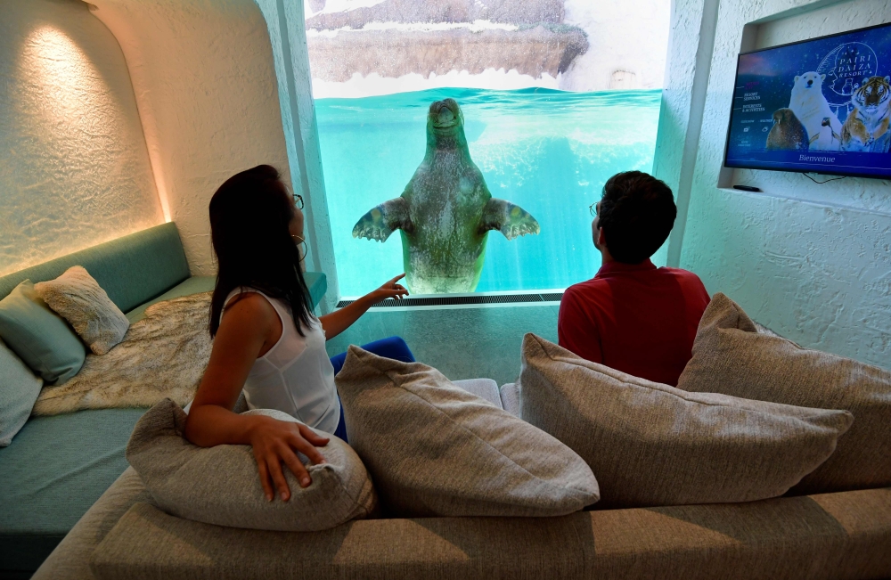 فيما يختنق قسم كبير من أوروبا الغربية بسبب موجة حر تجتاح المنطقة منذ أيام، يمكن لزوار متنزه حيواني بلجيكي الاحتماء من القيظ والتمتع برؤية حيوانات تعيش في المناطق القطبية من داخل مقصوراتهم. فقد استصلح متنزه «بايري دايزا» ست غرف لتنقل الزوار إلى أجواء المنطقة القطبية الشمالية، مع نوافذ تطل على حوض لحيوانات الفظ تتيح مشاهدة هذه الثدييات البحرية الضخمة تسبح أمامهم بحرية.