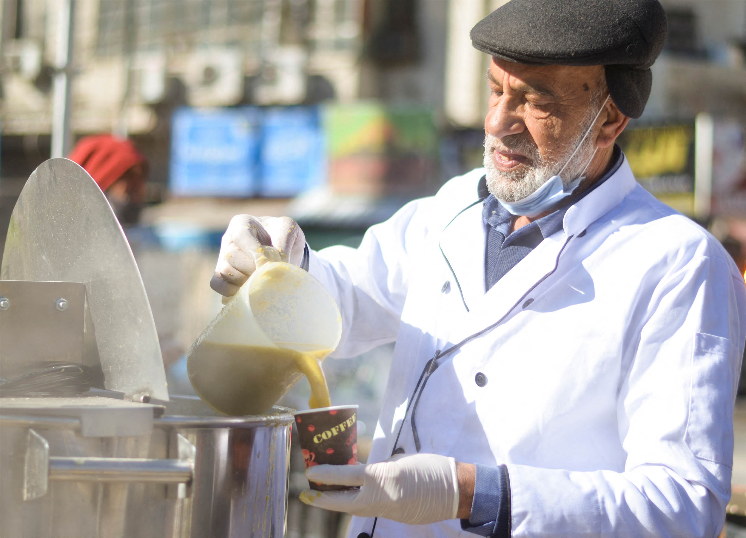 ويعلو صوت البيشاوي أو أحد أفراد فريق من المتطوعين معه بالنداء "سبيل.. سبيل لوجه الله تعالى". ووصل ما وزعوه في ساعتين فحسب إلى 1500 كوب من الحساء الساخن.