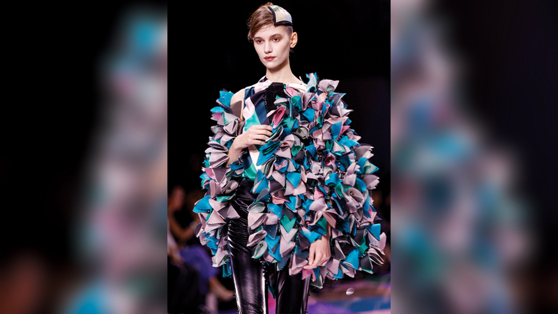 وسارت عارضات الأزياء، أول من أمس، بثبات على منصة عرض لامعة وهن يرتدين الملابس التي كانت تحاكي ألوان وأشكال المنصة التي تلونت بالوردي والأخضر والبنفسجي الباهت.