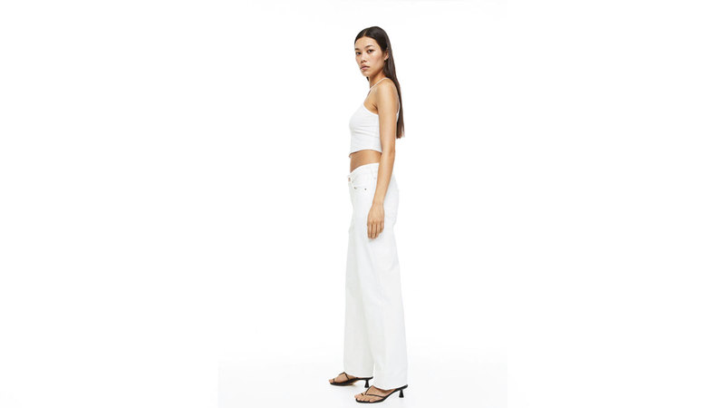 • الجينز الأبيض يطل بقصة ذات أرجل واسعة توفر راحة الارتداء.