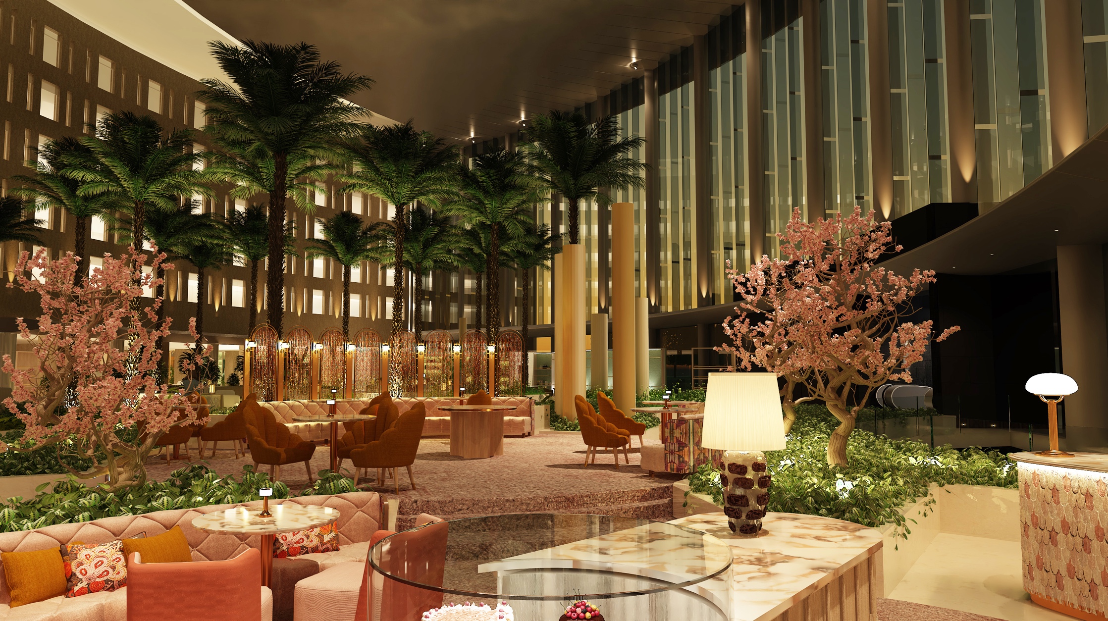 فور وصولهم، يدخل الضيوف إلى بهو الفندق الشاهق الذي يتسم بجدران زجاجية وتصميم مقوّس على شكل عين الإله الفرعوني رع. وكالعادة، تخطف ساعة والدورف أستوريا الأيقونية الأضواء، باعتبارها سمةً من السمات التي تتميّز بها فنادق والدورف أستوريا حول العالم، فتستعرض الوقت داخل حلقتَين من المياه المتدفّقة لتستحضر إلى الأذهان نهر النيل والهندسة المعمارية الفرعونية.