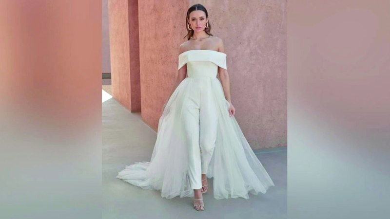 كما يخطف فستان الزفاف الأنظار من خلال الذيل الطويل، الذي يعكس الفخامة والأبهة. ويسري ذلك أيضاً على الأكمام الخفاشية، التي يمكن خلعها.