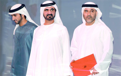كرّم صاحب السمو الشيخ محمد بن راشد آل مكتوم، نائب رئيس الدولة رئيس مجلس الوزراء حاكم دبي، مدير إدارة أول في إدارة الترخيص العقاري في دبي، يوسف السيد الهاشمي، خلال حفل توزيع جوائز برنامج دبي للأداء الحكومي المتميز الذي أقيم أخيراً.