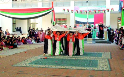شاركت طالبات مدرسة الوثبة للتعليم الأساسي بمنطقة الوثبة، في أبوظبي، في الاحتفال باليوم الوطني الـ،39 بعدد من الفعاليات التراثية والوطنية، قدمن خلالها لوحات فنية تترجم حبهن للوطن.
