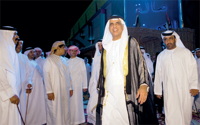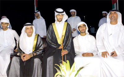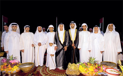 وقدمت إحدى الفرق الحربية أهازيجها وفنونها وشلاتها الإماراتية ابتهاجاً بهذه المناسبة السعيدة .
