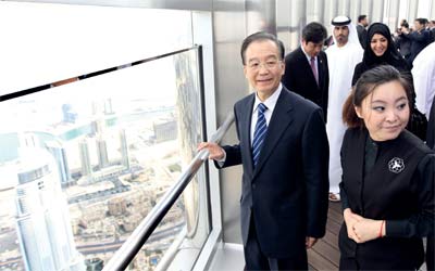 قام رئيس مجلس الدولة الصيني، ون جياو باو، والوفد المرافق، بجولة استطلاعية وسياحية في عدد من مرافق دبي التجارية والسياحية، إذ زار منطقة برج خليفة، وتجوّل في محيطه، وشاهد الحركات الراقصة للنافورة العملاقة التي تعد الأكبر عالمياً، ثم صعد إلى الدور 124 في برج خليفة وشاهد معالم مدينة دبي، مبدياً دهشته بنهضة الإمارات الحديثة عموماً، وتقدم دبي وتميزها كمدينة عالمية استطاعت بإنجازاتها ورؤية صاحب السموّ الشيخ محمد بن راشد آل مكتوم، أن تتحدى الصعاب وتصل إلى العالمية، ما جعلها محط أنظار رجال الأعمال والشركات الاستثمارية والسياحية وغيرهم.