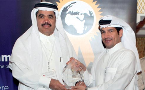 المنصوري (يمين) يتسلم جائزة «سما دبي». تصوير: باتريك كاستيلو