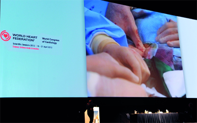 شهدت فعاليات المؤتمر العالمي لأمراض القلب، أمس، بثاً مباشراً لعلاج حالتين مرضيتين معقدتين، من داخل غرف القسطرة بمستشفيات هيئة الصحة في دبي، إلى قاعات المؤتمر في مركز دبي الدولي للمؤتمرات والمعارض، إحداهما لتغيير الصمام الأبهر عن طريق القسطرة، والثانية لزراعة دعامة للقلب قابلة للذوبان بعد تسعة أشهر، وهذه هي المرة الأولى التي يتم فيها بث مثل هذه العمليات إلى قاعات المؤتمر.