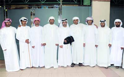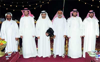 حضر الشيخ هزاع بن خليفة بن شخبوط آل نهيان، والشيخ حمدان بن خليفة بن شخبوط آل نهيان، حفل العشاء الذي أقامه سعيد عبيد الغول الكعبي، بمناسبة زفاف نجله خالد على كريمة راشد عبيد الغول الكعبي.