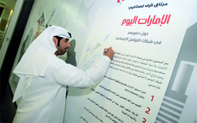 أطلقت صحيفة «الإمارات اليوم» من مقرها الجديد على شارع الشيخ زايد في دبي، أمس، مبادرة جديدة، بإعلان ميثاق شرف لصحافييها حول حضورهم في شبكات التواصل الاجتماعي على «الإنترنت»، بما يعزز الالتزام بالنقد الموضوعي من دون الإساءة عبر الكتابة أو الصور أو الإشارات والعلامات.