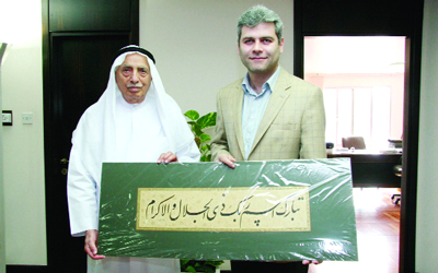 وفي نهاية الزيارة قدم الوفد لجمعة الماجد هدية عبارة عن لوحة خطية لآية قرآنية، وشكر الوفد على ذلك، وتمنى استمرار التعاون في خدمة الخط العربي والثقافة الفارسية.