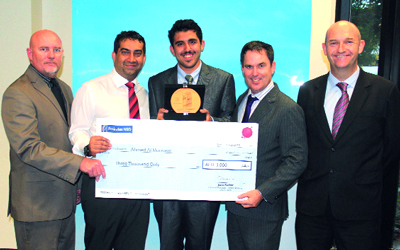 وفاز الطالب أحمد الموسوي بالجائزة الثالثة في المسابقة الوطنية، التي تمت بالتزامن مع اليوم الخاص باكتساب الخبرة المصرفية في بنك الإمارات دبي الوطني. وشارك في المسابقة نحو 200 طالب.