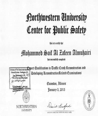 وخضعت شهادة «المستشار» التي حصل عليها الزفين للتصديق من جانب سفارة الدولة في الولايات المتحدة، ما يمكنه من إجراء اختبارات للراغبين في الحصول على درجة «خبير» في إعادة بناء الحوادث، والاستفادة بخبراته في القضايا المرورية الكبرى.