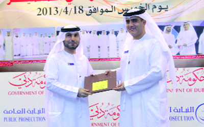 كرّم النائب العام لإمارة دبي، المستشار عصام عيسى الحميدان، موظفي وموظفات النيابة العامة بدبي، الفائزين بجوائز برنامج دبي للأداء الحكومي المتميز 2012، وذلك في الحفل الذي أقامته النيابـة بحضور المحامي العام رئيس المكتب الفني للنائب العام، المستشار خليفة بن ديماس السـويدي، ورؤساء النيابات، ومديري الإدارات، وجمع غفير من أعضاء وموظفي النيابة.