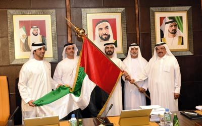 محمد بن راشد يتسلم العلم من نهيان بن مبارك في مجلس الوزراء بحضور حمدان بن راشد وسيف بن زايد ومنصور بن زايد. من المصدر