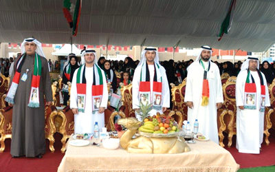 وأدى المشاركون قسم الولاء، بينما شاركت مروحيتان لقيادة الطيران المشترك بنثر الورود، وألقى الشاعران راشد الرميثي وهادي المنصوري عدداً من القصائد، وقدم طلبة مدرسة المشرف عروضاً تراثية.