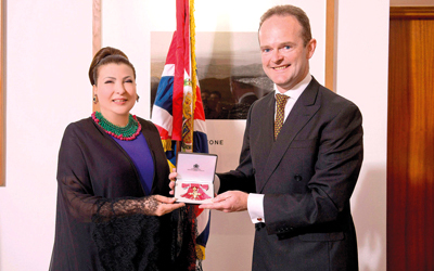 منحت جلالة الملكة إليزابيث الثانية، ممثلةً بسفير المملكة المتحدة لدى الإمارات، دومينيك جيرمي، وسام «رتبة الإمبراطورية البريطانية» لمُؤسس مجموعة أبوظبي للثقافة والفنون، هدى الخميس كانو، تقديراً لدورها الريادي في تعزيز التعاون الثقافي بين كل من الإمارات والمملكة المتحدة، وذلك بحضور حشد من الشخصيات الثقافية والمجتمعية، أول من أمس، في مقر سفارة المملكة المتحدة في أبوظبي.