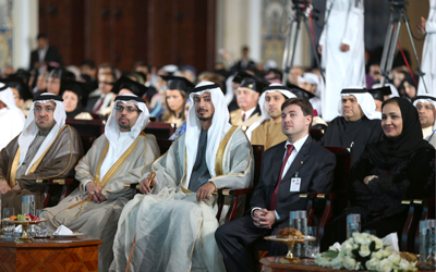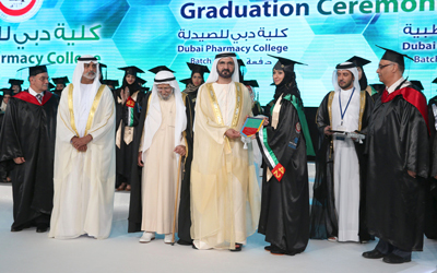 تكريم كرّم صاحب السموّ الشيخ محمد بن راشد، خلال الحفل، الـ 10 الأوائل من الطالبات في الدفعة الـ23 في كلية دبي الطبية، والـ18 في كلية دبي للصيدلة. |