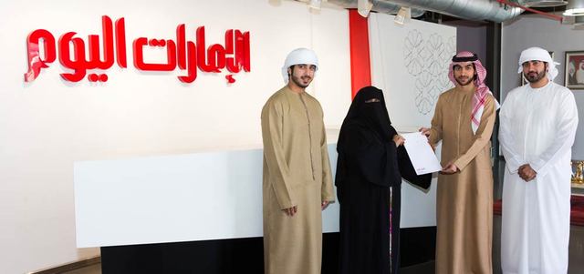 تسلّمت المواطنة شيخة أحمد البلوشي جائزتها، وهي مفتاح سيارة «أوبل» من مدير مكتب رئيس تحرير «الإمارات اليوم»، الزميل يوسف أحمد، وذلك في مقر الصحيفة بحضور أبنائها.