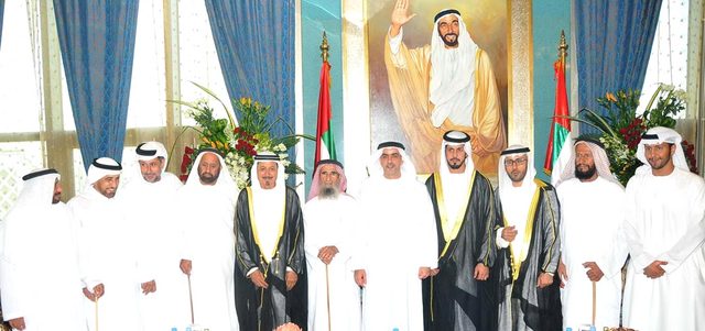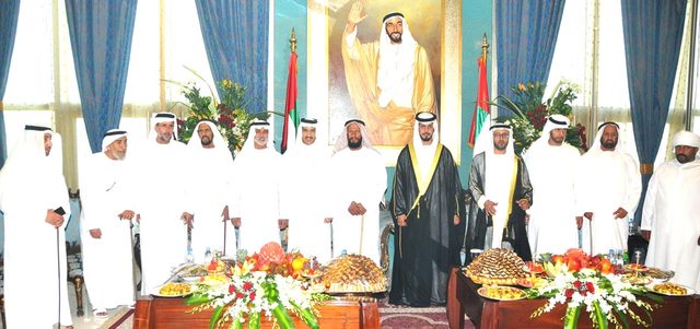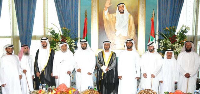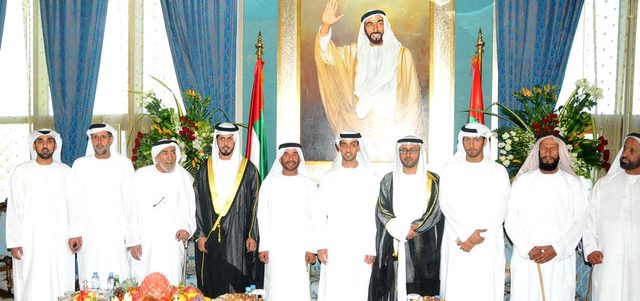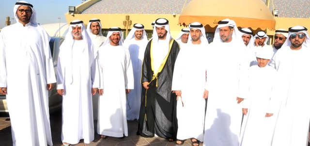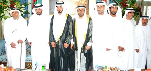 سرور بن محمد وسيف بن زايد وأحمد بن محمد بن راشد وخالد بن زايد والشيوخ يحضرون أفراح المنصوري