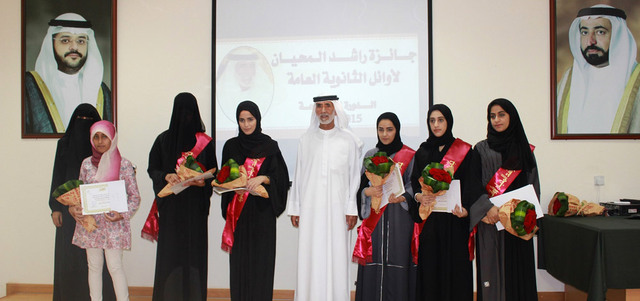 واحتفل مجلس أولياء أمور الطلبة والطالبات بأوائل الثانوية العامة من مدارس المنطقة الوسطى الحكومية والخاصة ممن حاوزوا أعلى النسب المئوية التي زادت على 98% وبلغوا 12 طالباً وطالبة، واستحقوا 100 ألف درهم مقدمة من راشد المحيان.