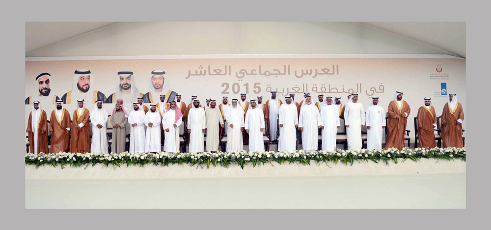 جاء ذلك خلال الاحتفال بالعرس الجماعي العاشر لأبناء المنطقة الغربية الذي شهده سموه مساء اليوم بمجلس مدينة زايد بالمنطقة الغربية وشارك فيه 21 شابا من جميع مدن المنطقة الغربية بتنظيم من ديوان ممثل الحاكم في المنطقة الغربية ورعاية " أدنوك " ومجموعة شركاتها بحضور اللواء الركن طيار فارس خلف خلفان المزروعي رئيس جهاز حماية المنشئات الحيوية والسواحل و مدير عام شركة بترول ابوظبي الوطنية " أدنوك" عبدالله ناصر السويدي و الرميثي مدير مكتب سمو ممثل الحاكم في المنطقة الغربية سلطان بن خلفان وعدد من كبار المسؤولين بشركة أدنوك ووجهاء وأعيان المنطقة الغربية وأهالي وأقارب العرسان.