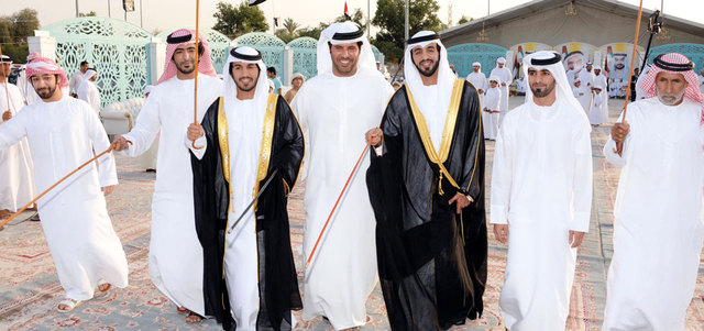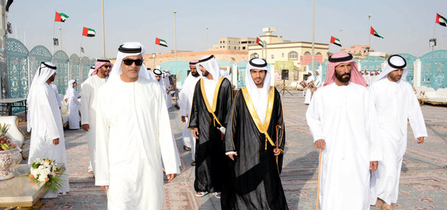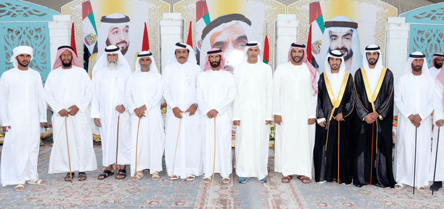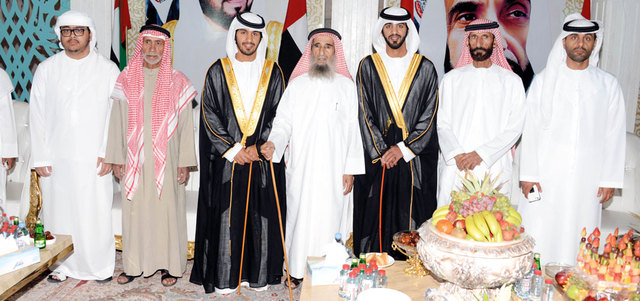 حضر الشيخ خليفة بن سيف بن محمد آل نهيان، والشيخ ذياب بن سيف بن محمد آل نهيان، حفل الاستقبال الذي أقامه سيف المنصوري، بمناسبة زفاف نجليه ناصر وسعيد إلى كريمتَي علي غانم المنصوري.