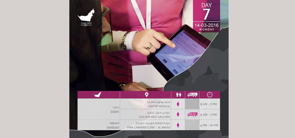 وستستقبل العيادات الطبية المراجعين، ومن مختلف الجنسيات، للحصول على خدمة الكشف المبكر عن مرض سرطان الثدي مجاناً من الساعة 9:00 صباحاً وحتى 7:00 مساءً، في مواقع مختارة بكل واحدة من إمارات الدولة ومدنها، وستتواجد العيادات اليوم في كلِ من مركز يونايتد الطبي، غولدن مايلز مول في دبي، وواجهة المجاز المائية