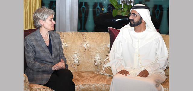 جاء ذلك خلال استقبال سموّه، بحضور ولي عهده سمو الشيخ حمدان بن محمد بن راشد آل مكتوم، وسمو الشيخ مكتوم بن محمد بن راشد آل مكتوم، نائب حاكم دبي، المدير العام لمنظمة الأمم المتحدة للتربية والعلوم والثقافة (اليونسكو)، الدكتورة إيرينا بوكوفا.