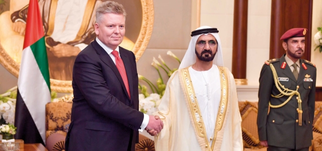 تسلّم صاحب السموّ الشيخ محمد بن راشد آل مكتوم، نائب رئيس الدولة رئيس مجلس الوزراء حاكم دبي، بـ«قصر المشرف» في العاصمة أبوظبي، قبل ظهر أمس، بحضور سموّ الشيخ حمدان بن محمد بن راشد آل مكتوم، ولي عهد دبي، والفريق سموّ الشيخ سيف بن زايد آل نهيان، نائب رئيس مجلس الوزراء وزير الداخلية، وسموّ الشيخ منصور بن زايد آل نهيان، نائب رئيس مجلس الوزراء وزير شؤون الرئاسة، وسموّ الشيخ عبدالله بن زايد آل نهيان، وزير الخارجية والتعاون الدولي، أوراق اعتماد عدد من السفراء الجدد لدى الدولة.