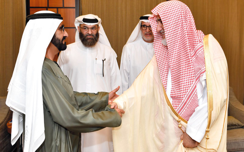 استقبل صاحب السمو الشيخ محمد بن راشد آل مكتوم، نائب رئيس الدولة رئيس مجلس الوزراء حاكم دبي، بحضور سمو الشيخ مكتوم بن محمد بن راشد آل مكتوم، نائب حاكم دبي، مساء أمس، وزير الشؤون الإسلامية والدعوة والإرشاد في المملكة العربية السعودية الشقيقة، الشيخ صالح بن عبدالعزيز بن محمد آل الشيخ، والوفد المرافق له، الذي قدم إلى سموه التهاني بالشهر الفضيل.